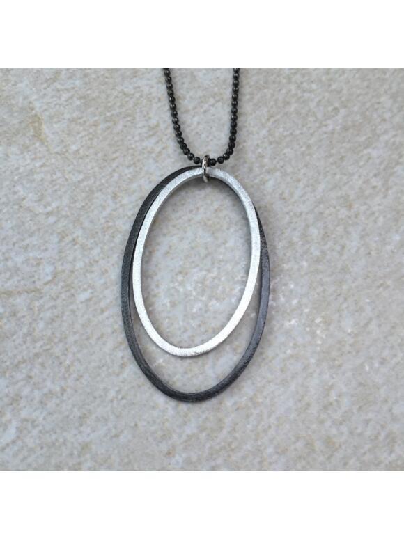 Lang Three M oksideret halskæde med ovalt vedhæng i sølv og oksideret sølv. Ca. 5 cm lang og 3 cm bred. Kæden kan kortes op efter ønske. Stål med sølv belægning. (Læs mere)