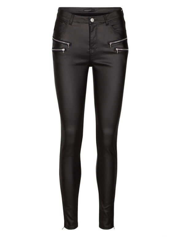 Aida Sort coated bukser fra Freequent. Smalle ben i ankel længde med lynlås forneden i benene. For og baglommer og dobbelt pyntelynlås eforan på buksen. Lækker stræk kvalitet. 76 % viscose, 21 % polyamid og 3 % elastan. Vask ved 30 grader. (Læs mere)