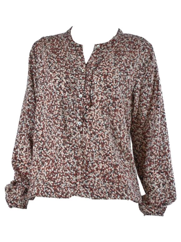 Ofelia Vera skjorte/bluse med lange ærmer, stolpelukning med knapper foran og lille flæse kant langs med stolpelukningen. Elastik både i ærmer og forneden. Fint blomstret print i rosa,offwhite, brunt og brændt orange på sort bund. 100 % rayon. Vask ved 30 (Læs mere)