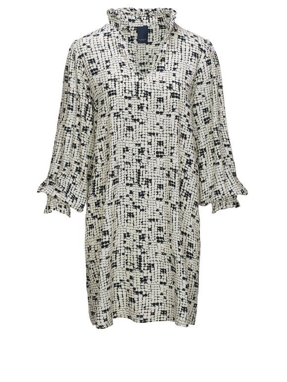 Leonia skjorte kjole med V-hals og kravekant rundt i nakken med lille flæse. Kjolen har lange ærmer med elastikkant. Lige op og ned facon. Råhvid bund med sort mønster. 100 % viscose. Vask ved 30 grader. Max krymp 5 %. (Læs mere)